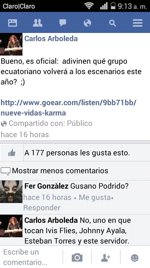 …Ayer el Emo me envió por WhatsApp una captura de pantalla de la cuenta de Facebook de Carlitos Arboleda con la noticia de que se reúnen. Arboleda, Ivis Flies, Esteban Torres y Johnny Ayala revivirán a Karma a 20 años del Seres –largamente el mejor disco en la historia del rock ecuatoriano– y yo podré cumplir mi sueño de verlos en concierto. Casi me caigo de la silla con tremenda noticia. Si les parece algo exagerado es porque no aman el Seres tanto como yo, no tienen una cierta obsesión con cosas como éstas, no han estado esperando 20 años por este momento y, en resumidas cuentas, no son yo.